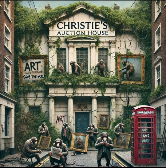 "Bidding for Extinction" openly challenges the contemporary concept of artistic and cultural value. Set in front of the London headquarters of the prestigious auction house Christie's, the work uses the symbolism of monkeys dressed as decaying businessmen to critique the decline of art in today's society. The monkeys, the central figures in the scene, climb the crumbling facade, holding once-priceless paintings that have now lost their worth, while wild vegetation overtakes the building, signaling that nature, indifferent to wealth and power, reclaims its spaces.