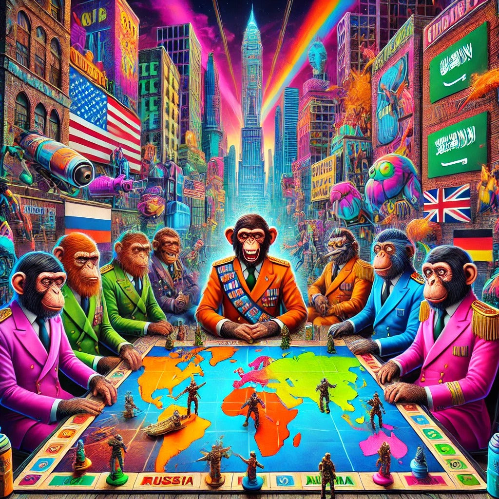 "When the powerful revert to their roots: monkeys in suits play Risk with the planet, trading human lives for land and oil. The only difference? This time, they’re not even pretending to be human."