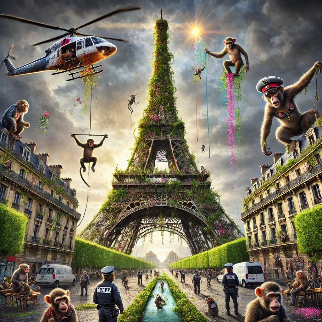 The artwork "Nature’s Revolution" presents a dystopian and visionary future where the Eiffel Tower, a symbol of modernity, is reclaimed by nature. In this surreal setting, rebellious monkeys—some dressed as police officers—convey a message of protest against climate change, emphasizing the urgency of global action. The fusion of nature and human intervention, depicted through street art and time-worn graffiti, creates a powerful call for deep reflection on sustainability and the reconciliation between humanity and the environment.