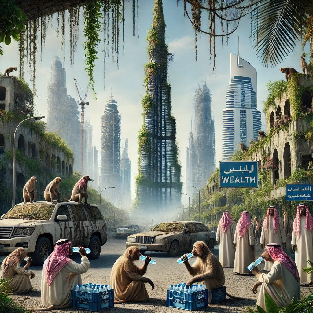 In a dystopian future, the Burj Khalifa—once a symbol of power and wealth—now stands in ruins, overtaken by nature and inhabited by monkeys dressed as sheikhs, hoarding water as the only true currency. This provocative artwork exposes the irony of a world that, despite controlling vast oil reserves, is powerless without its most essential resource: water. A stark critique of the illusion of wealth in a society that has lost touch with life's fundamental necessities.