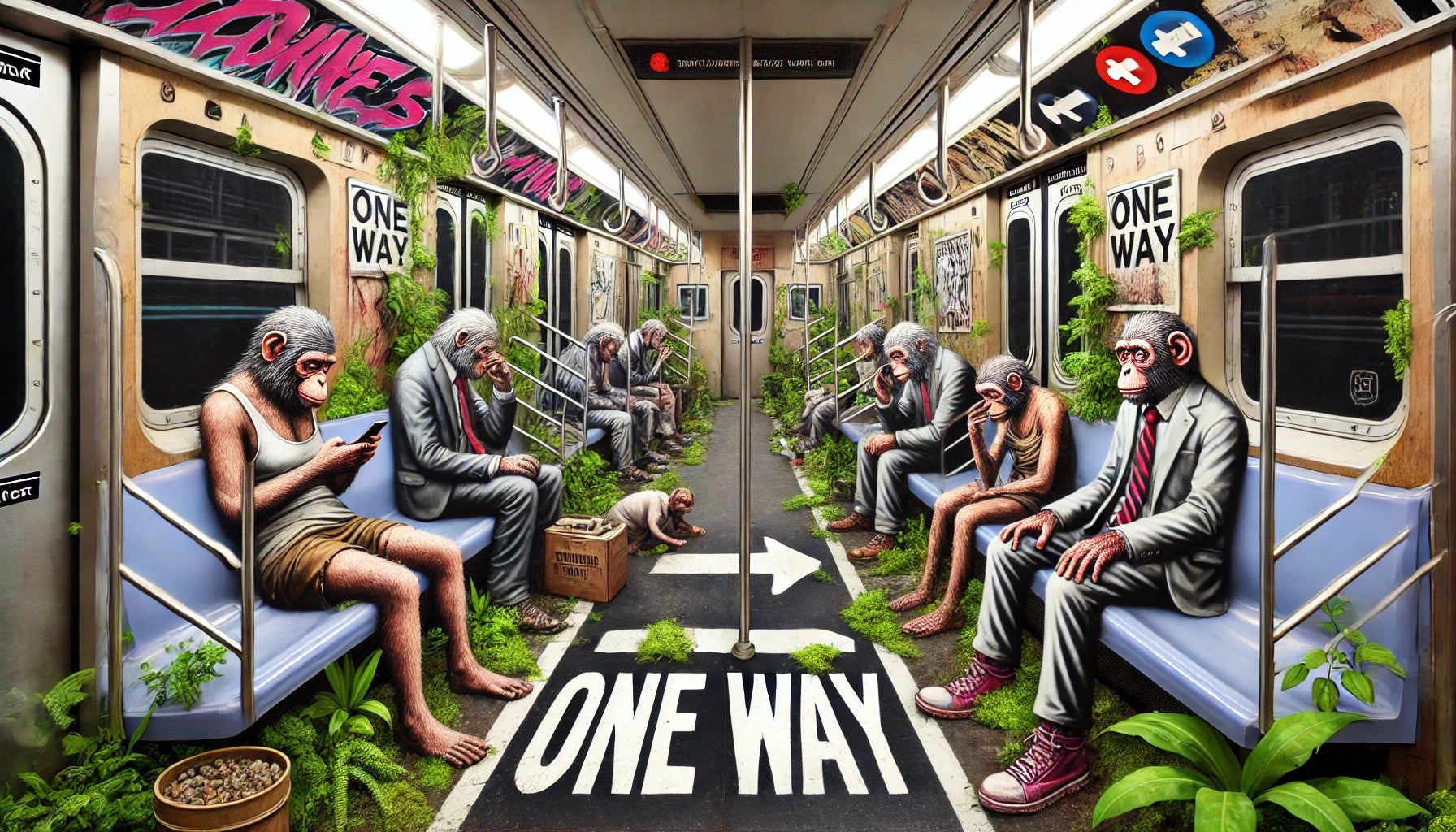 In this subway car, indifference has replaced humanity. Well-dressed monkeys stare at their screens, deliberately ignoring the beggar in the center. Technology isn't just a tool, it's a wall. Nature quietly creeps through the seats. An ironic provocation: we're closer than ever, but we see nothing.